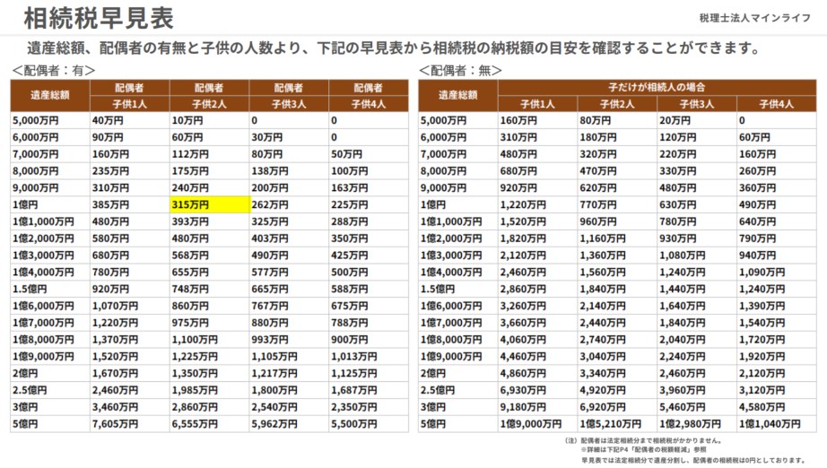 また、相続税早見表のうち「左の表」は配偶者がいる場合の相続税を表しています。