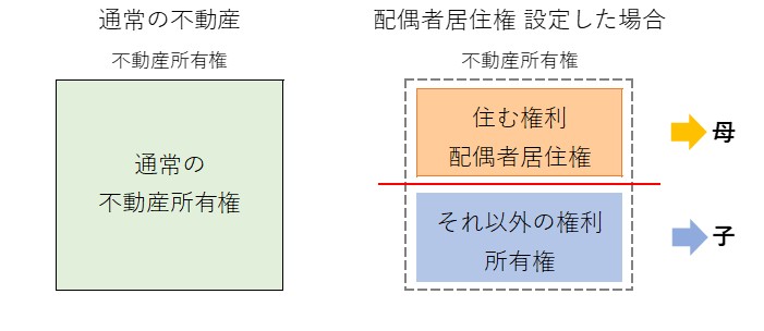 配偶者居住権とは、自宅に住む配偶者に「住む権利(居住権)」を、「それ以外の権利(所有権)」はその他の相続人が取得するという制度です。