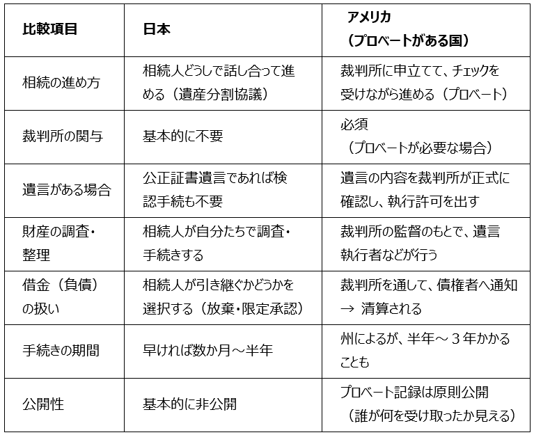 日本の相続手続きとプロベート手続きが必要なアメリカの相続手続きには次のような違いがあります。